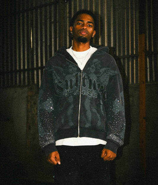 Black wash Rhinestones culture zip up hoodie